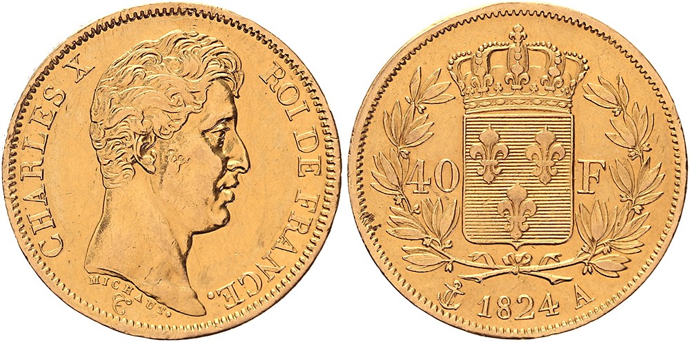 40 Francs 1824A (Paris). Fr. 547; Gad. 1105; KM 721.1. TTB / Superbe (VF / EF).