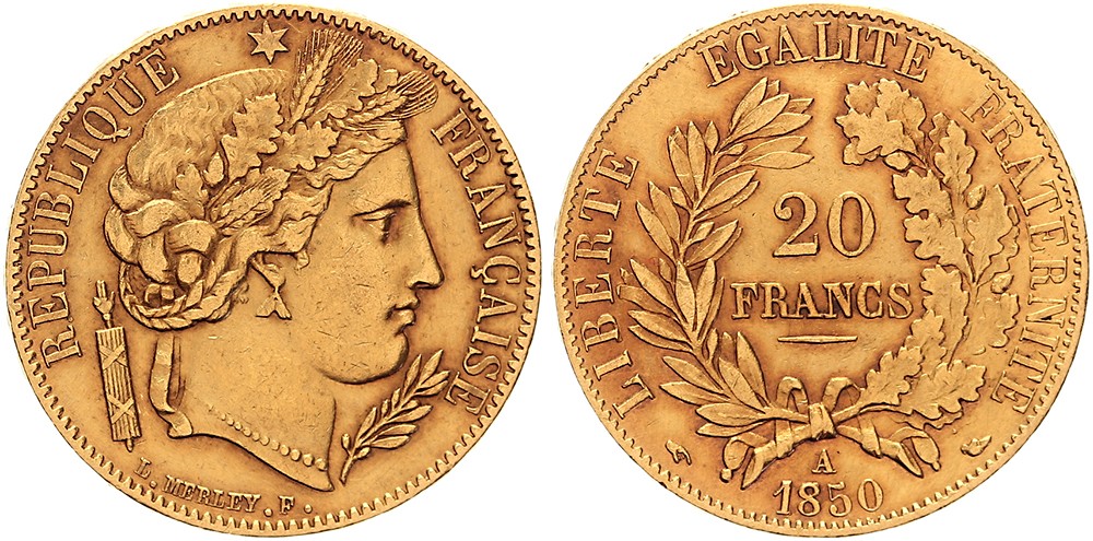 20 Francs 1850A (Paris). Fr. 566; Gad. 1059; KM 762. Superbe (EF).