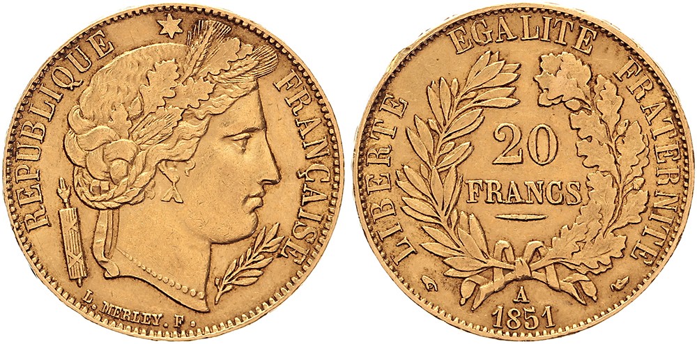 20 Francs 1851A (Paris). Fr. 566; Gad. 1059; KM 762. Petit coup sur la tranche. TTB / Superbe (VF / EF).