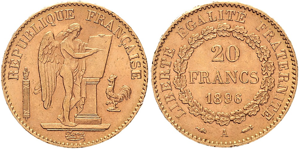 20 Francs 1896A (Paris). Fr. 592; Gad. 1063; KM 825. Petit coup sur la tranche. Superbe (EF).
