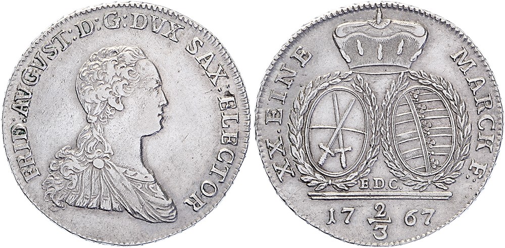 2/3 Taler 1767 EDC. Schön 220; KM 981. Sehr schön.