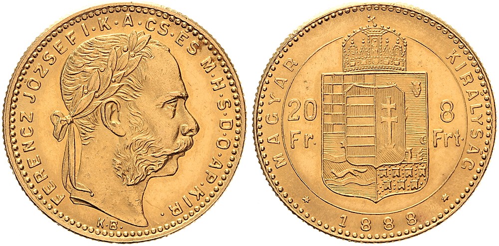 20 Francs / 8 Forint 1888. Fr. 243; KM 467. Unc.