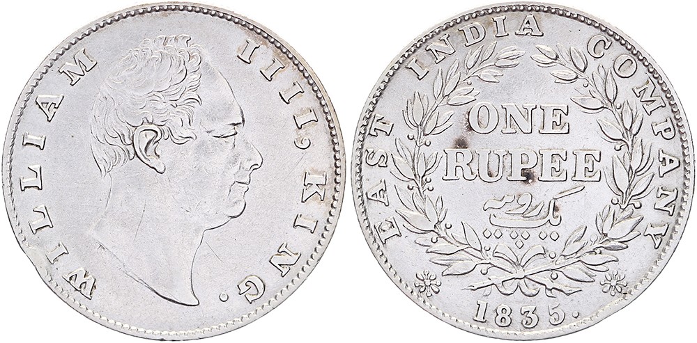 Rupee 1835 (c), F on truncation. KM 450.2. Edge nick. EF.