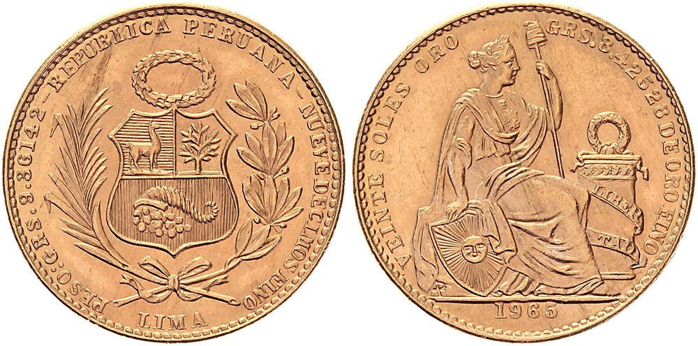 20 Soles 1965 Liberty seated. Fr. 80; KM 229. Unc.