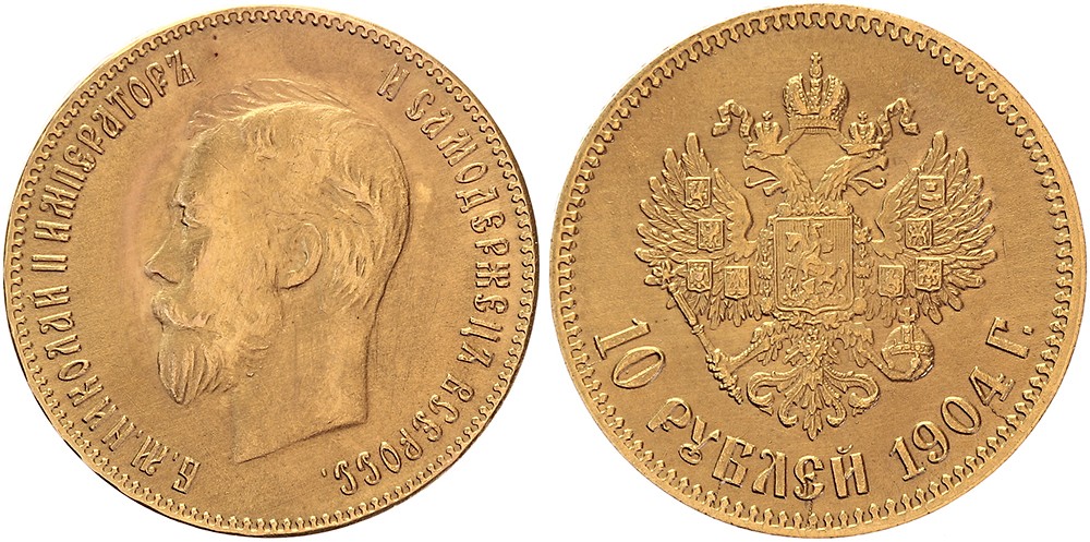 10 Roubles 1904 ‘yellow’ gold. Fr. 179; KM Y64. EF.