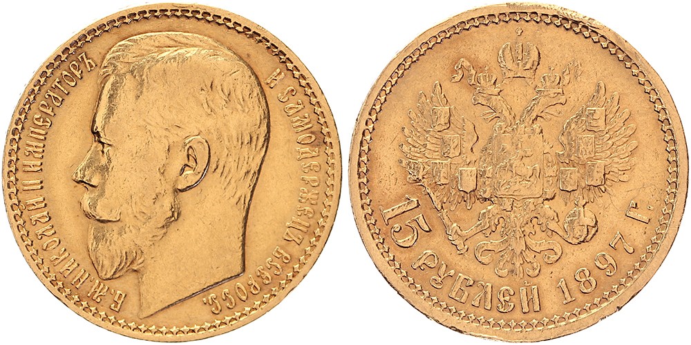 15 Roubles 1897. Fr. 177; KM Y65.2. Edge nick, cleaned. VF.
