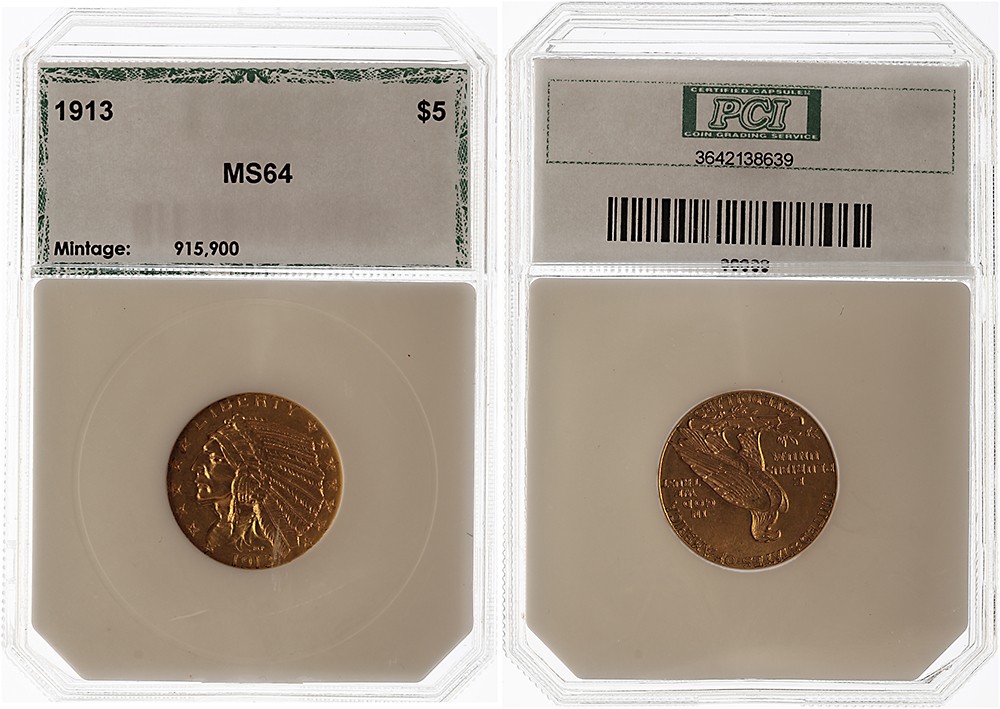 5 Dollars 1913. Fr.148; KM 129. Slabbed by PCI / MS 64. EF.