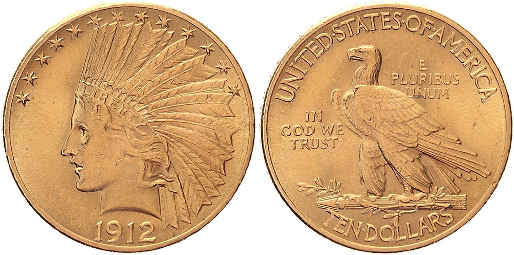 10 Dollars 1912 Indian Head. Fr. 166; KM 130. Nice EF.