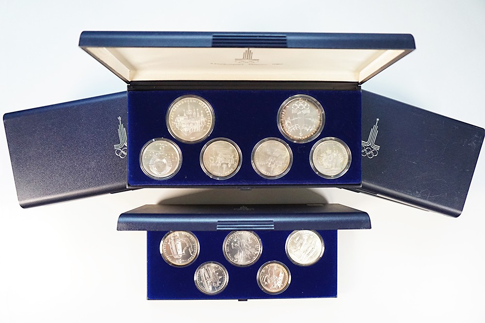 Rusland Olympische Spelen 1980. Acht langwerpige cassettes met zilveren 5 en 10 Roebelstukken (44). Netto zilver: 990 gram.