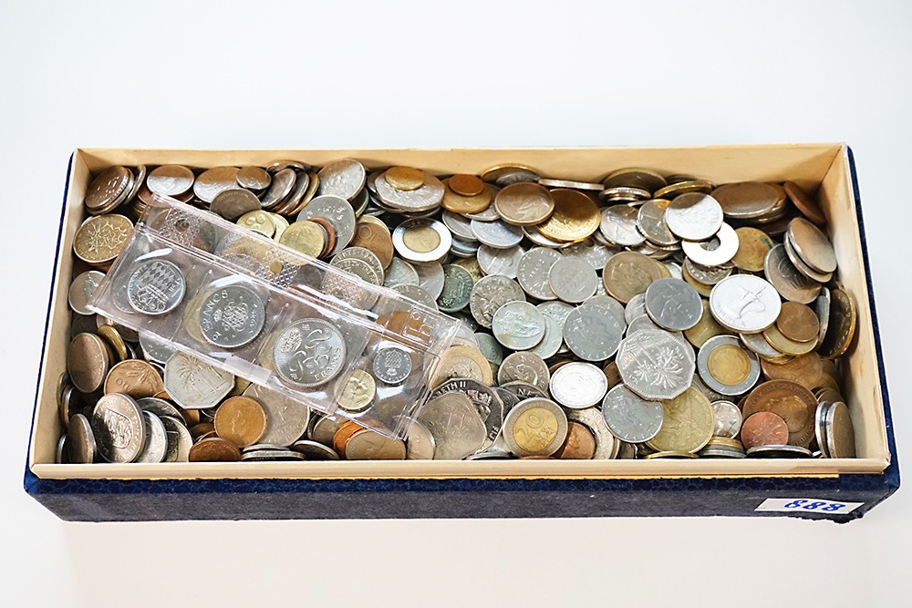 Langwerpige ‘Ringers’ doos met ruim 8 kg. eenvoudige wereldmunten, kilowaar.