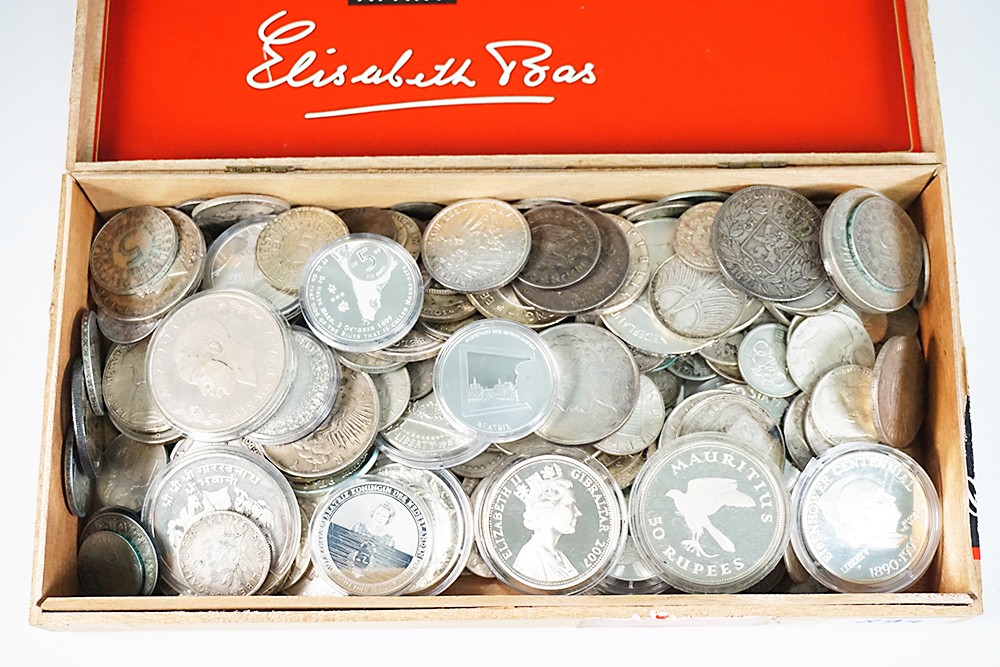 Kistje zilveren wereldmunten, vnl. 19e en 20e eeuw. Bruto 2,97 kg.