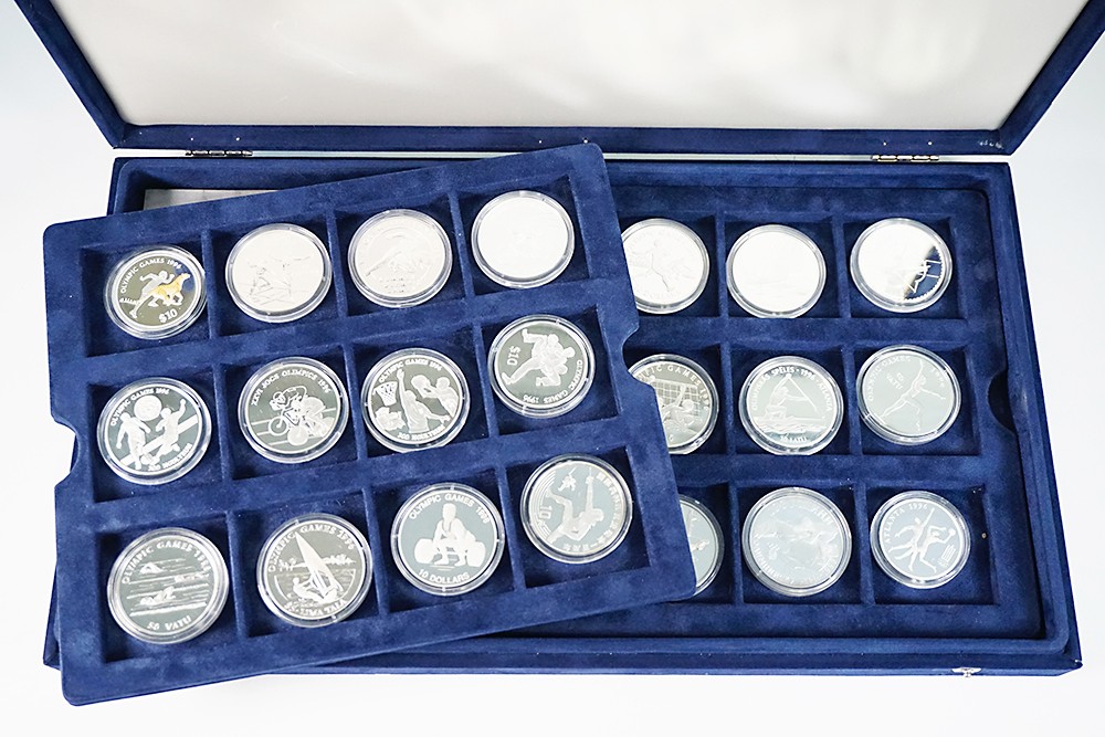 Blauwe cassette met 36 zilveren munten, Olympische Spelen 1996 Atlanta. proof.