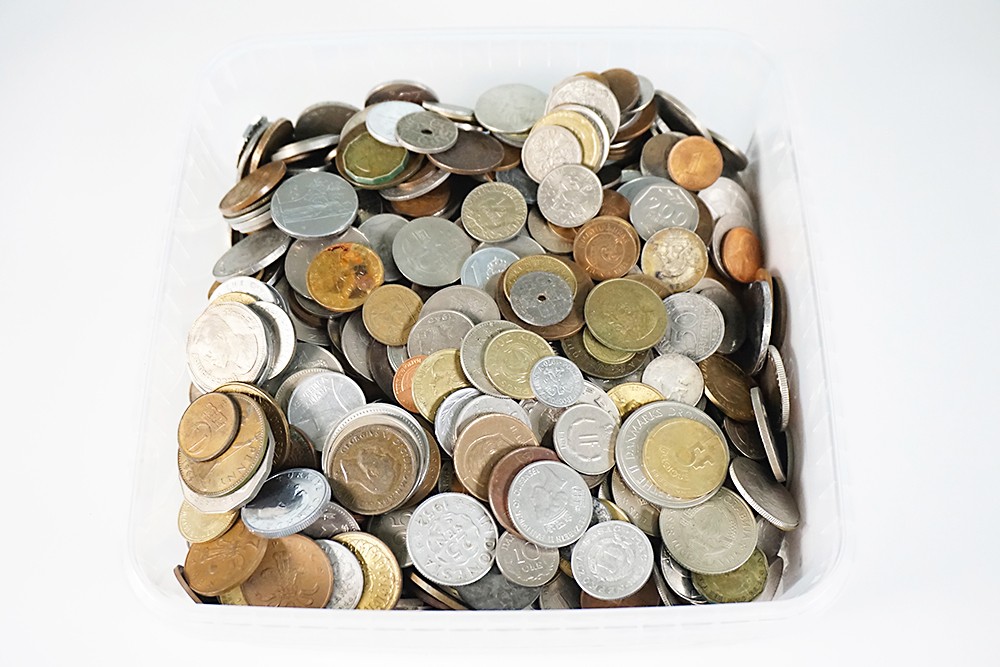 Plastic bak met ruim 6 kg. eenvoudige wereldmunten, kilowaar.