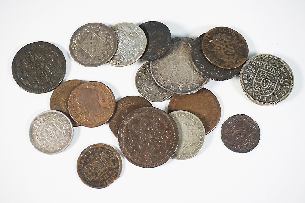 Blikje ‘Barkleys’ Spaanse muntjes 18e + 19e eeuw (21). Onuitgezocht. Mogelijk interessant.