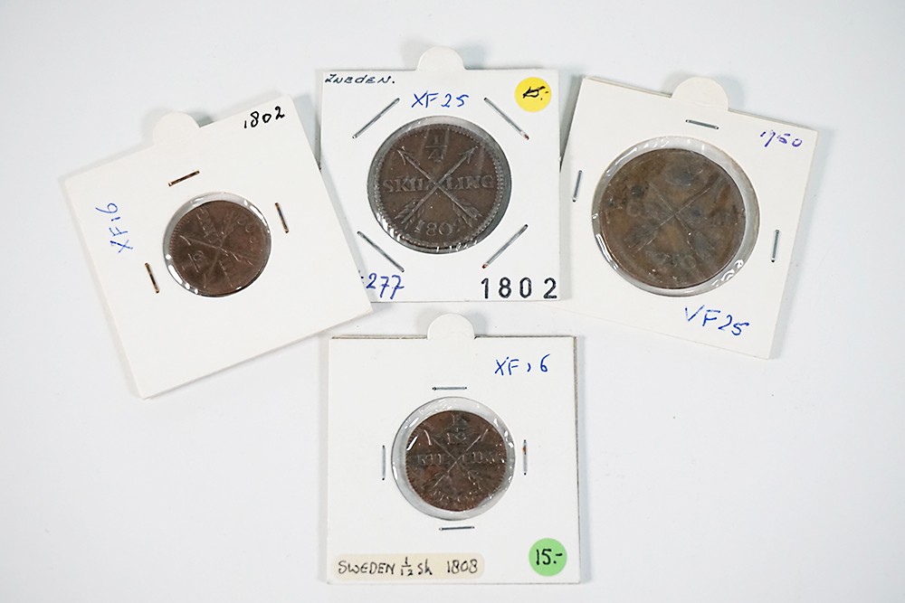 Zweden (4) ¼ Skilling 1802; 1/12 Skilling 1802, 1808; 1 Skilling 1750. Zeer fraai en beter.