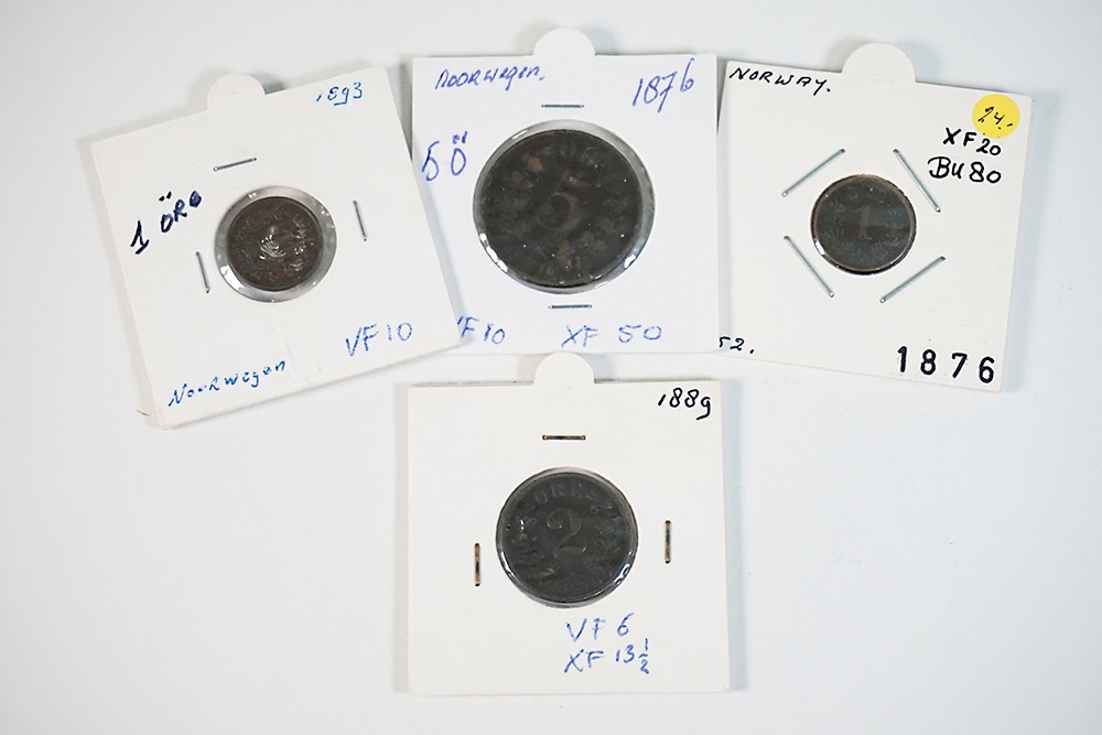 Noorwegen (4) 1 Öre 1876, 1893; 2 Öre 1889; 5 Öre 1876. KM 352, 353, 349). Zeer fraai en beter.