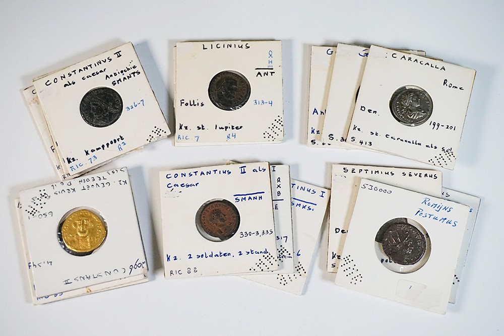 Blikje (18) Romeinse muntjes (16) en twee gouden Byzantijnse munten (solidus van Heraclius en Constans II). Allen gedetermineerd. Gemiddeld zeer fraai.