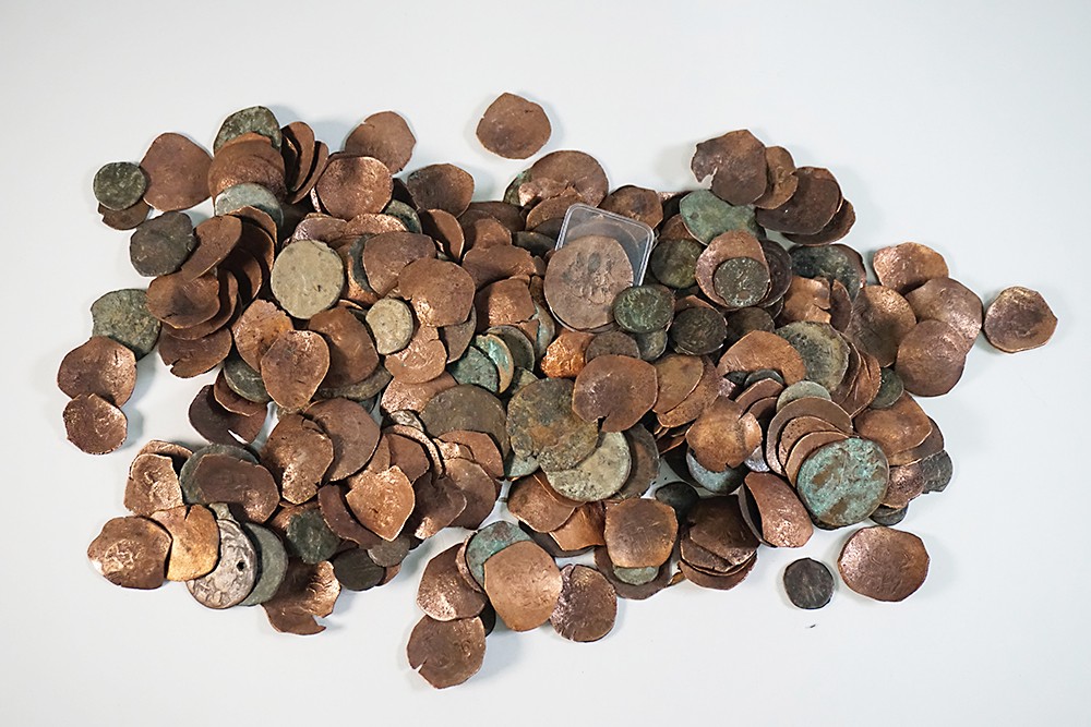 Langwerpig doosje met ca. 1 kg. bronzen Byzantijnse ‘schoteltjes’. Grondvondst, boterslechte kwaliteit.