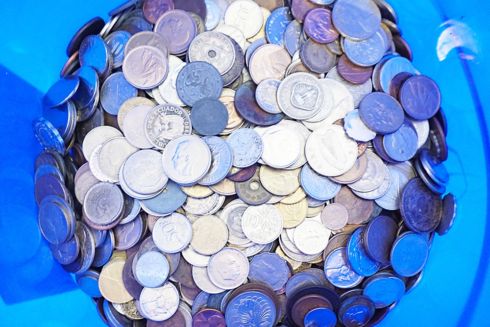 Blauw/rood plastic tonnetje met ruim 15 kg. eenvoudige wereldmunten, kilowaar.