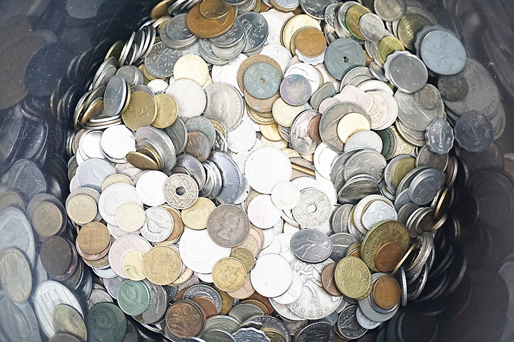 Blauw plastic tonnetje ‘strooizout’ met ruim 15 kg. eenvoudige wereldmunten, kilowaar.
