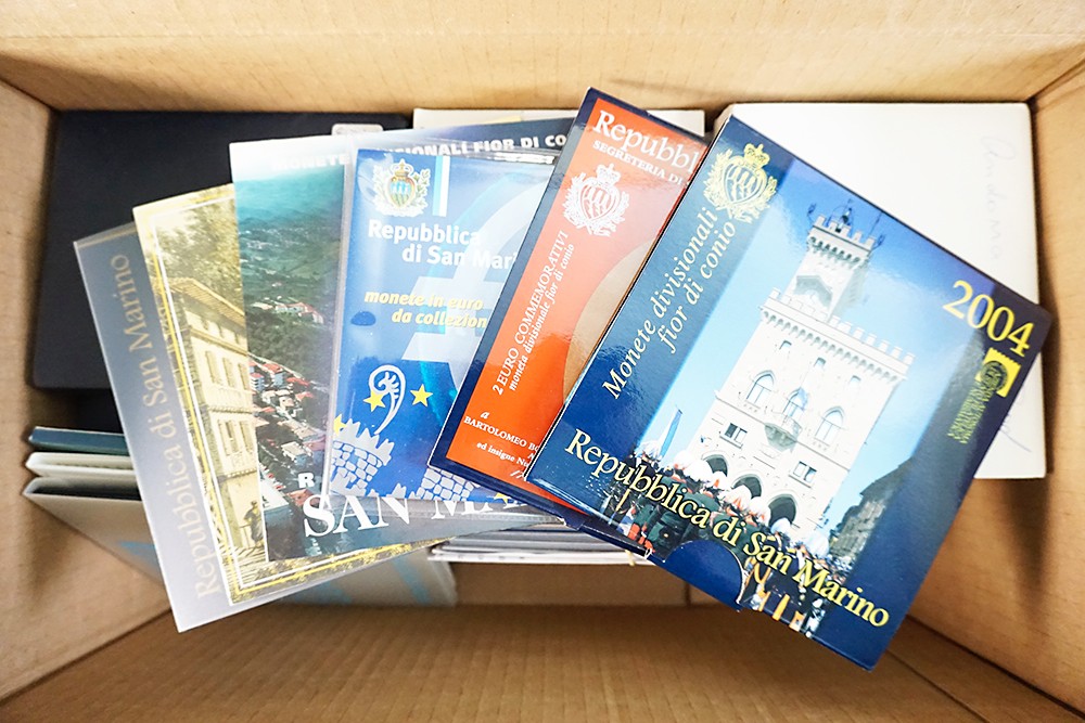 Doos met ruim 30 luxe cassettes periode 2002-2011 met daarin de “Euro Coin Collection” van ondermeer Denemarken, Zweden, Polen, Cyprus, Engeland, Schotland. Voor wie het leuk vindt!