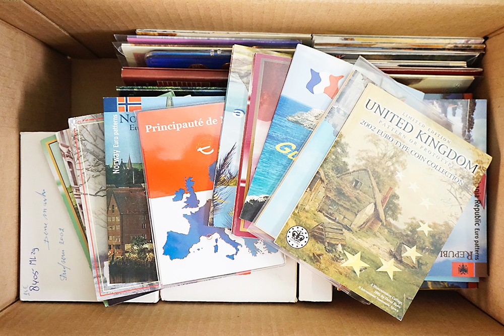 Doos met 50 Proof- en Probe sets van Euro’s uit de vroege begin periode (2000-2005) ook wel patterns genoemd. Afkomstig uit landen als Denemarken, Zweden, Albanië.