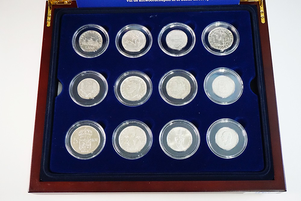 Houten cassette ‘Europees Zilver Erfgoed” met 12 zilveren Europese munten 20e eeuw. Uitg. KNM.
