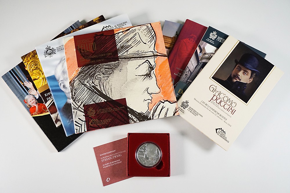 Lot (9) San Marino (6): euromuntset 2012, 2013 (beide met €5); €2 herdenking 2014 (Puccini, Bramante); 2015 (Dante, Eenwording). Toegevoegd: euromuntset Slowakije 2012; België 2014 en Oostenrijk 20€ 2013 Stefan Zweig (proof). Alles in originele verpakking.