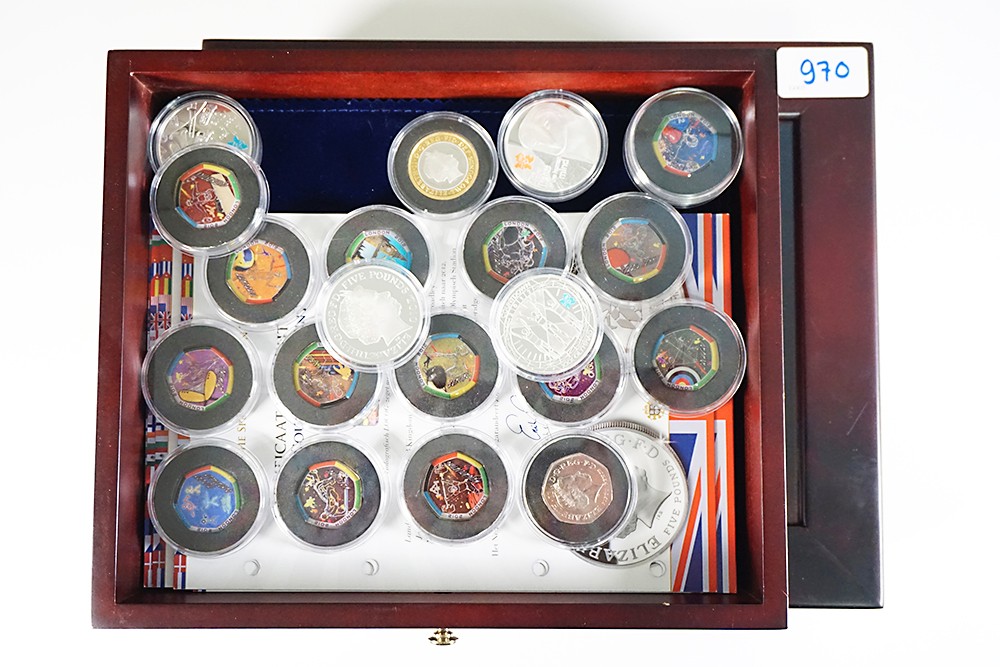 Houten cassette/vitrine Olympische Spelen London 2012 met 12 x UK£ 5; 1 x UK£ 2 en 12 x 50 pence met gekleurde keerzijde.