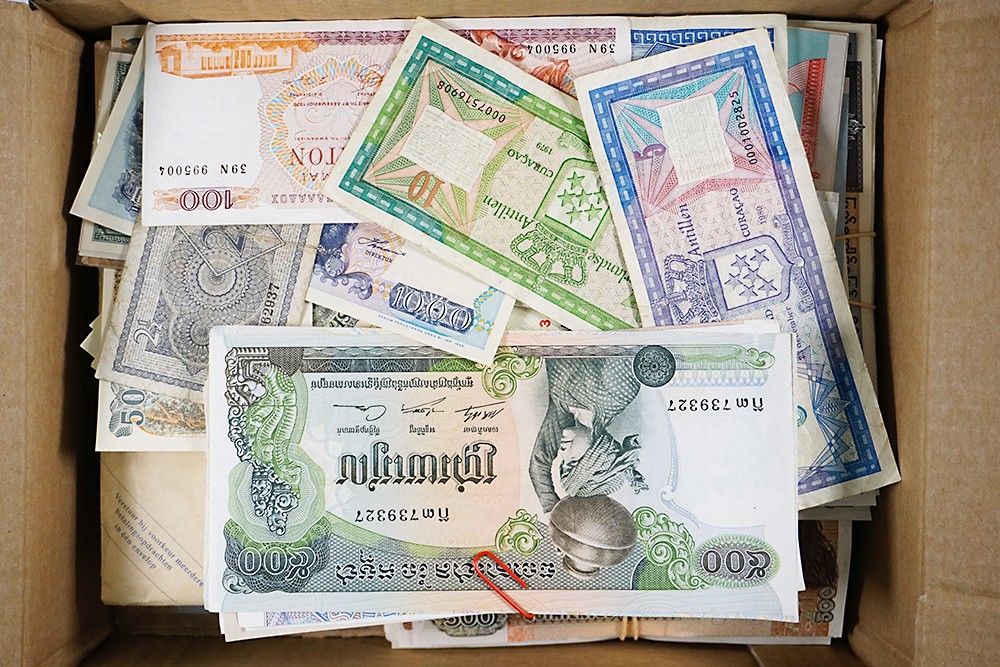 Doos bankbiljetten wereld grote hoeveelheid onuitgezochte biljetten uit vele landen, waaronder Nederland. Leuk!