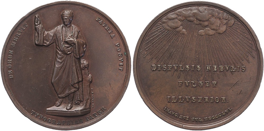 1856 Haarlem. Onthulling standbeeld Laurens Janszoon Coster. Het standbeeld. / Tekst onder wolken met zonnestralen. Æ 75. Dirks 779; Jehne 68. Elion. Randoneffenheden. Zeer fraai.
