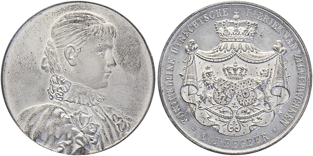 (1893) Reclamepenning Begeer t.g.v. tentoonstelling Batavia. Charmant borstbeeld koningin Wilhelmina naar rechts (geen omschrift). / Op een gekroonde hermelijnen mantel het alliantiewapen van Nederland en Waldeck-Pyrmont. Tink/zinklegering 47. Vgl. Zwierzina 1059; KB I-189. In origineel doosje, helaas uit elkaar. Prachtig.