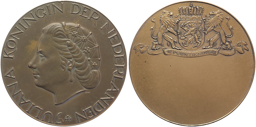 (1948) Ere/prijspenning koningin Juliana. Hoofd Juliana naar links. / Inscriptieruimte onder rijkswapen. Æ 60. L.O. Wenckebach. In originele cassette ’s Rijks Munt + brief ‘Dienst van het Koninklijk Huis’. Prachtig.