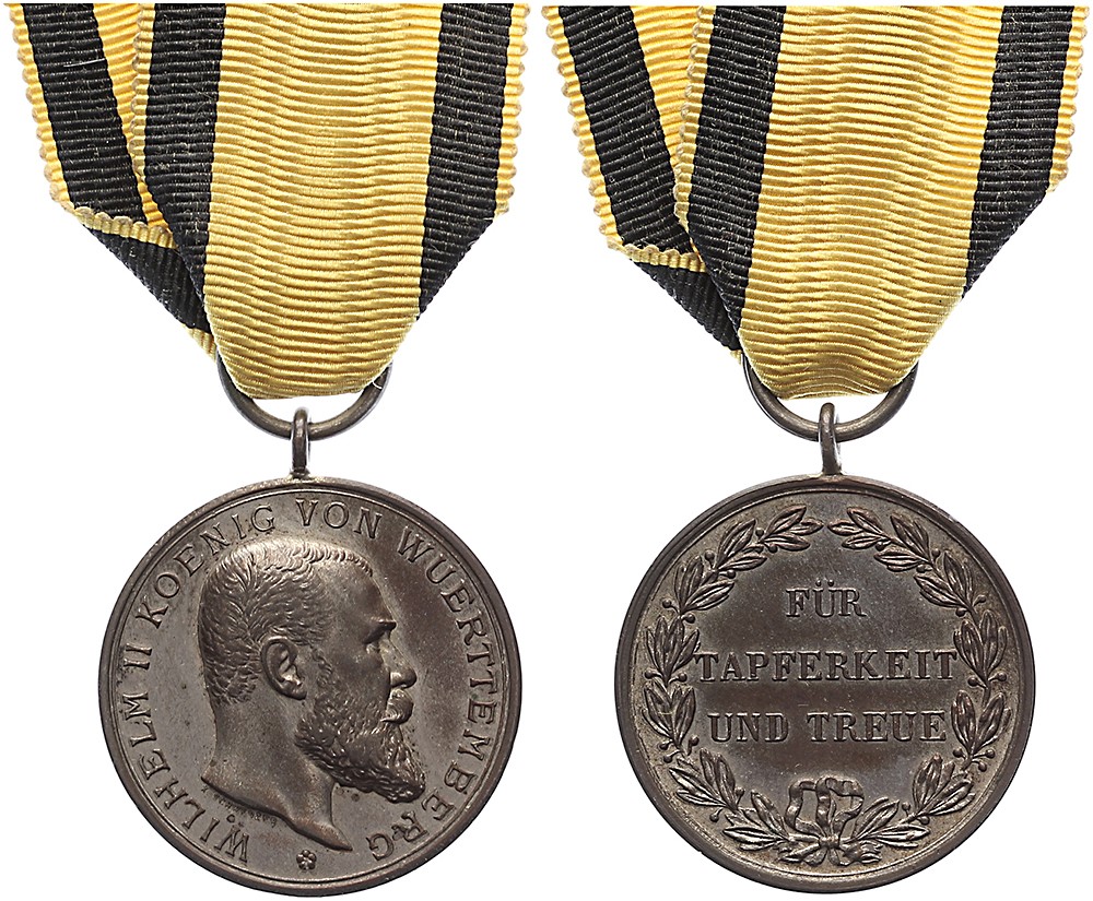 Württemberg. Wilhelm II, “Für Tapferheit und Treue”. Æ silvered 28,5 with ribbon. Klenau 108/ 109. EF.