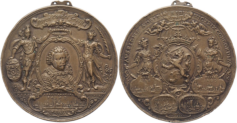 1630 Overwinningen van Stadhouder Prins Frederik Hendrik. Inname van ’s-Hertogenbosch. Borstbeeld van Frederik Hendrik driekwart naar rechts tussen Mars en Victoria. / Nederlandse leeuw op schild gehouden door Prudentia en Fortitudo. Æ 67. vL II-193/190.1; JMP 1953.110. A. van de Wilge. Draagoogje afgebroken. Zeer fraai.