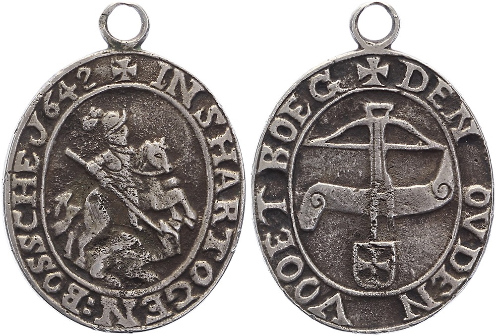 1642 Penning van het Schuttersgilde ‘Den Ouden Voetboog’. St. Joris in gevecht met een draak. / Een voetboog met een banderol waarop geen nummer vermeld. Penning is mogelijk een ontwerp, vermoedelijk van zilver. Ovaal, afm. 34 x 29. Met draagoog. Vrijwel zeer fraai.