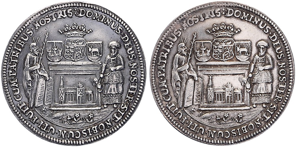 1647 Lot (2) Op het Eeuwfeest der Klassis van de Hervormde Gemeente in ’s-Hertogenbosch. Het gekroonde Stadswapen van Oisterwijk en Maasland. / Een Hebreeuwse tekst zijnde ‘ Jehovah’. AR 32. Ruim prachtig.