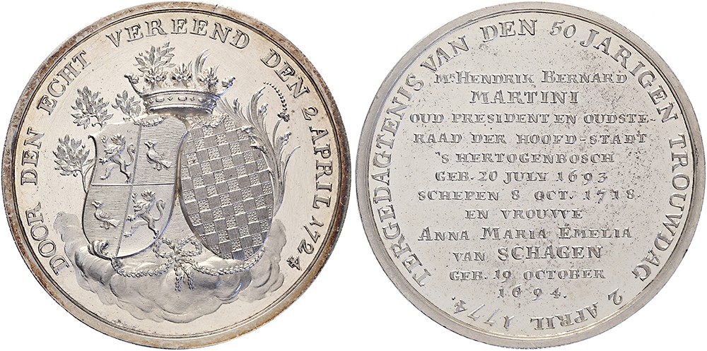 1774 50-jarig Huwelijk van Hendrik Martini en Anna van Schagen. Familiewapens op een wolk gedragen en daaromheen een lauwertakken. / Ter nagedachtenis aan den 50-jarige trouwdag 2 april 1774. AR 42,5. VvL. 491. In ivoren doosje met schroefdeksel. Ruim prachtig.