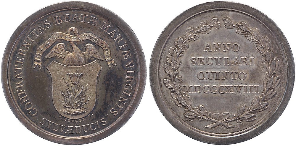 1818 Illustre Lieve Vrouwe Broederschap ‘Zwanenbroeders’ bestaat 30 jaar. Het ordeteken van de Broederschap. / In een krans van mirten- en eikenloof vier regels tekst. AR 37,5. Dirks 131. Oplage in zilver slechts 60 exemplaren. Prachtig.
