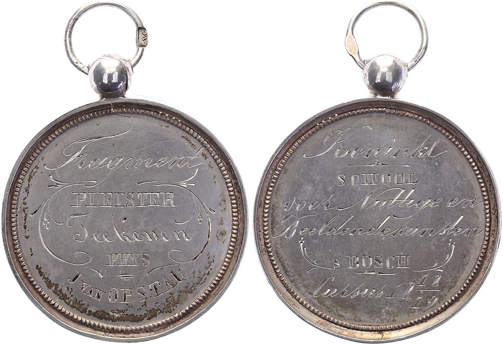 1818/1819 Beloningspenning uitgeloofd door de Koninklijke School voor Nuttige en Beeldende Kunsten te ’s-Hertogenbosch. Parelrandje rondom, vijf regels tekst. / Parelrandje rondom, zes regels tekst. AR 40. Met draagoog en ring. Zeer fraai.