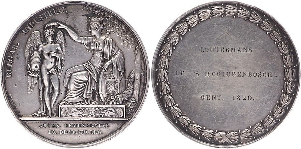 1820 Beloningspenning aan Franciscus Loutermans, fabrikant te ’s-Hertogenbosch. De nijverheid de arbeid kronende. / In een brede loofkrans drieregelige tekst gegraveerd. AR 58. Dirks 164. Braemt. Zeer fraai.