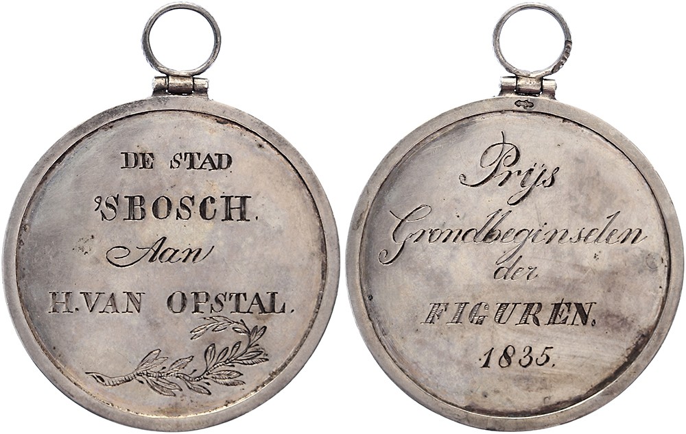 1835 Beloningspenning ’s-Hertogenbosch aan de beste leerling van de Koninklijke School voor Nuttige en Beeldende Kunsten. Vierregelige tekst boven lauwertak. / Vijfregelige tekst. AR 39. Met scharniertje en draagoog. Zeer fraai.