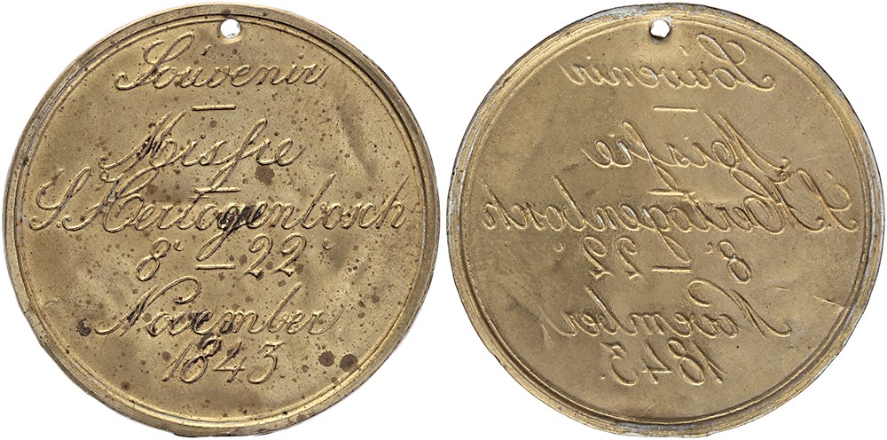 1843 Als voren. Variant. Zeer dun geslagen met incusum keerzijde. Messing 41,5. Bovenaan gaatje als draagoog. Apart! Fraai / zeer fraai.