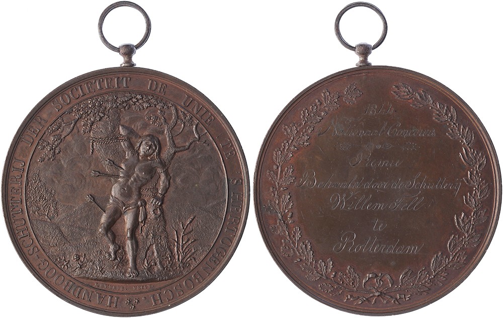 1844 Beloningspenning van de Handboogschutterij der Sociëteit ‘De Unie’ te ’s-Hertogenbosch. St. Sebastiaan met pijlen doorboord aan boom gebonden. / Zevenregelige tekst in krans van samengevlochten lauwertakken. Æ 63. Dirks 636. J. Everts. Prachtig.