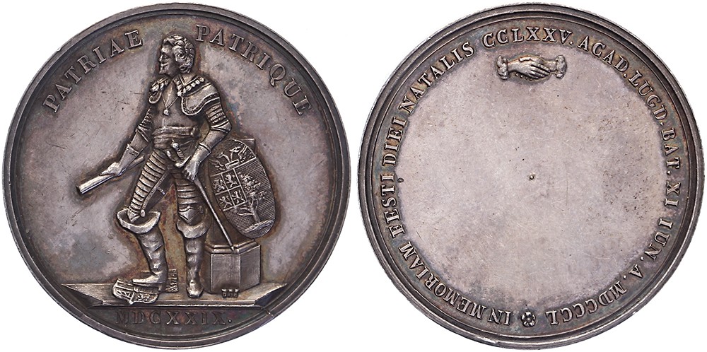 1850 Maskeradefeest van Studenten aan de Hoogeschool te Leiden bij het 275-jarig bestaan. Dit feest was gewijd aan het beleg en inname van ’s-Hertogenbosch in 1629 door Frederik Hendrik. Prins Frederik Hendrik van Oranje. / Uit de wolken komende handen (naam ontvanger niet ingevuld). AR 32. Dirks 706. Prachtig.