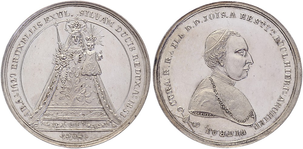 1853 Teruggave van het Mariabeeld van Brussel aan ’s-Hertogenbosch. Borstbeeld naar rechts. / Het Mariabeeld, rijk getooid en gekroond. AR 40,5. G. Van Gemert. Zeer zeldzaam. Dirks 752. Prachtig.