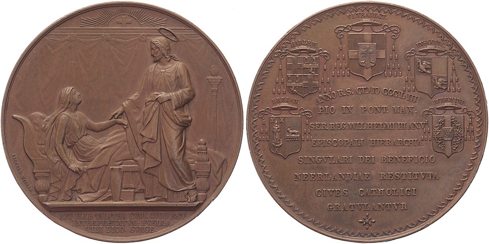 1853 Penning ter Herdenking van de Invoering der Bisschoppelijke Hiërarchie in Nederland en de instelling der vijf bisdommen. Antiek rustbed waarop de uit de doodslaap herrijzende dochter van Jairus. / De wapens der vijf bisdommen. Æ 60. Dirks 739. L. Wiener. Prachtig.