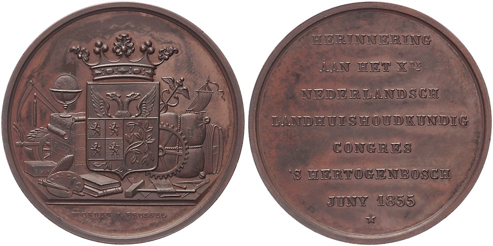 1855 Herinnering aan het tiende Landhuishoudkundig congres gehouden te ’s-Hertogenbosch. Gekroond wapen van ’s-Hertogenbosch. / zevenregelige tekst. Æ 41,5. Dirks 769. F. Wurden uit Brussel. Prachtig.