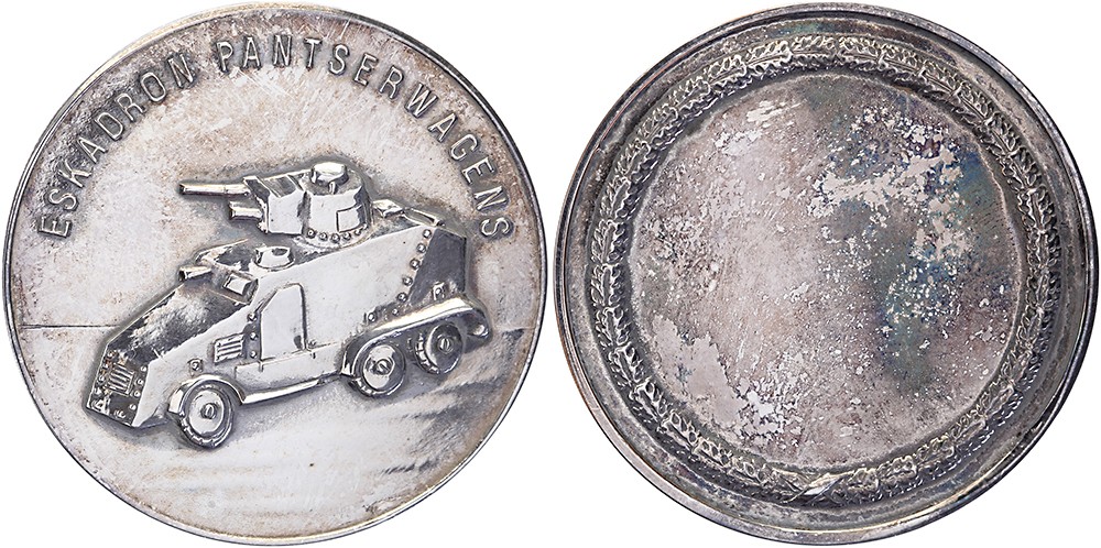 1936 Eskadron Pantserwagens voor Wereldoorlog II. Pantserwagen. / Lauwerkrans rondom (veld niet ingevuld). Verzilverd 46. Opgewreven. Zeer fraai.