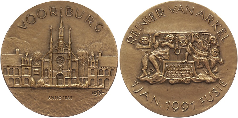 1997 Fusie tussen Reinier van Arkel te ’s-Hertogenbosch en Voorburg te Vught. Beide psychiatrische instituten. Gevelsteen Reinier van Arkel uit 1686. / Voorgevel van Voorburg te Vught anno 1885. Æ 60. Willem Slingerland. Prachtig.